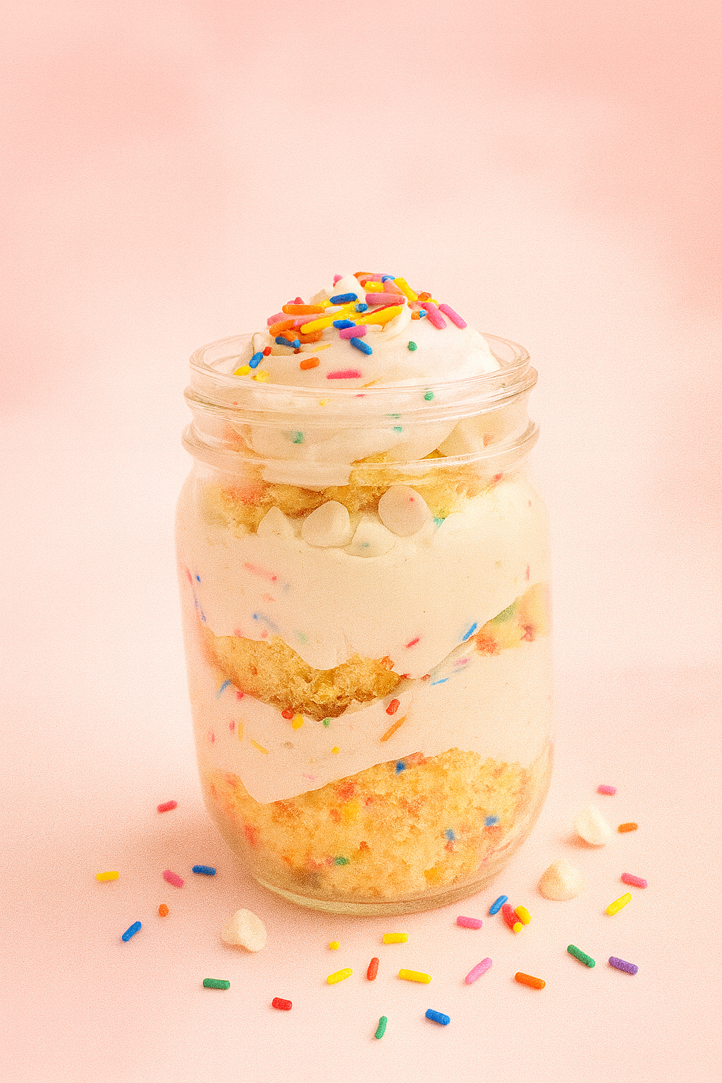Funfetti cake, vanilla frosting layers & rainbow sprinkles. -