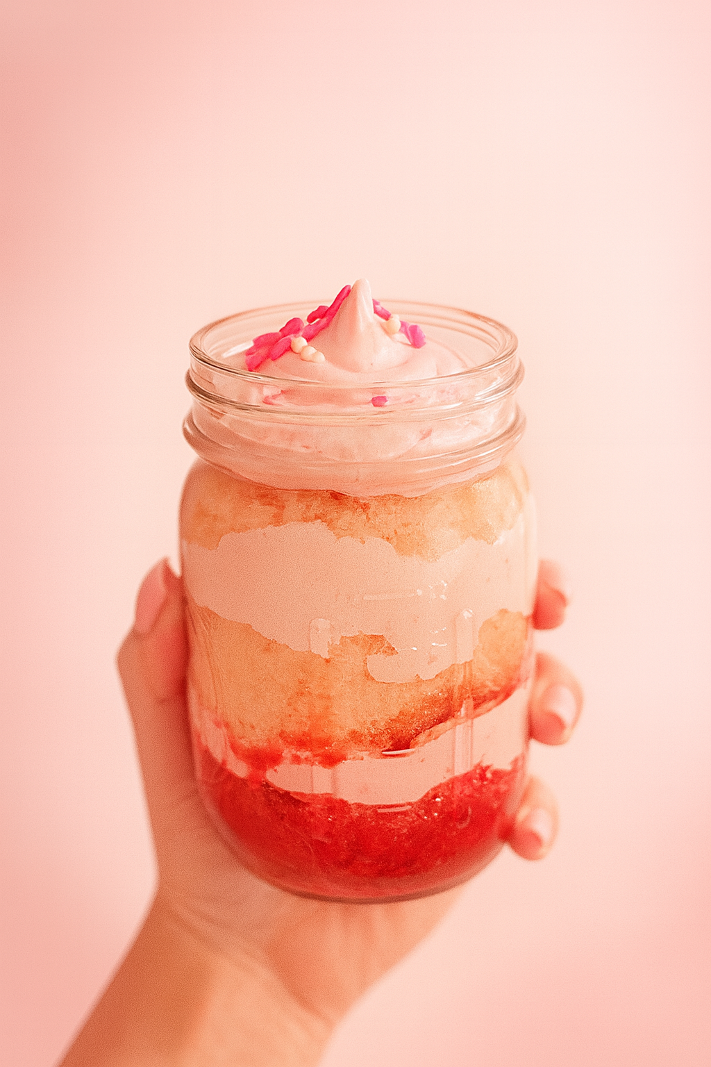 Vanilla cake, fresh strawberry compote & whipped cream layers. -